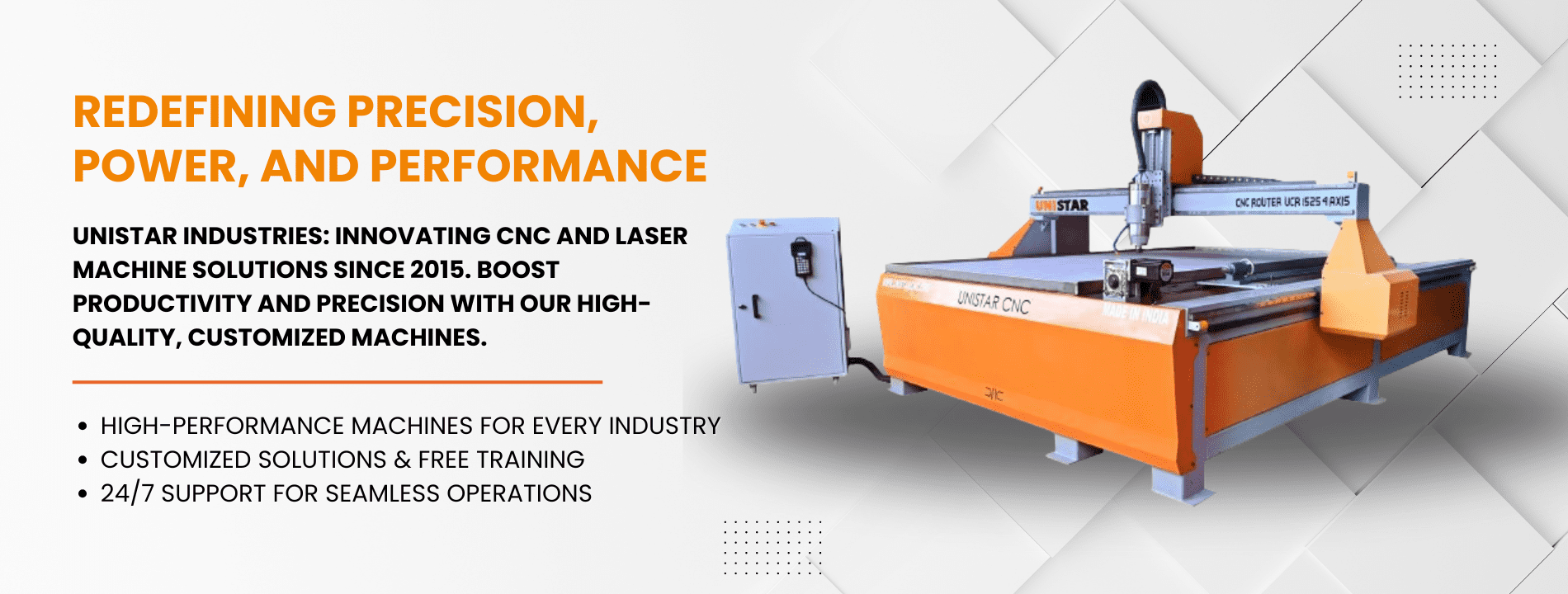 Established in 2015 in Pune, Maharashtra, Unistar Industries has emerged as a trusted leader in the design, manufacturing, and supply of high-quality CNC Routers, Laser Cutting Machines, and precision engineering solutions. As a forward-thinking partnership firm, led by Prashant Gawandi and Dyandev Choudhary, we are dedicated to delivering cutting-edge products that empower industries to achieve superior efficiency and accuracy.